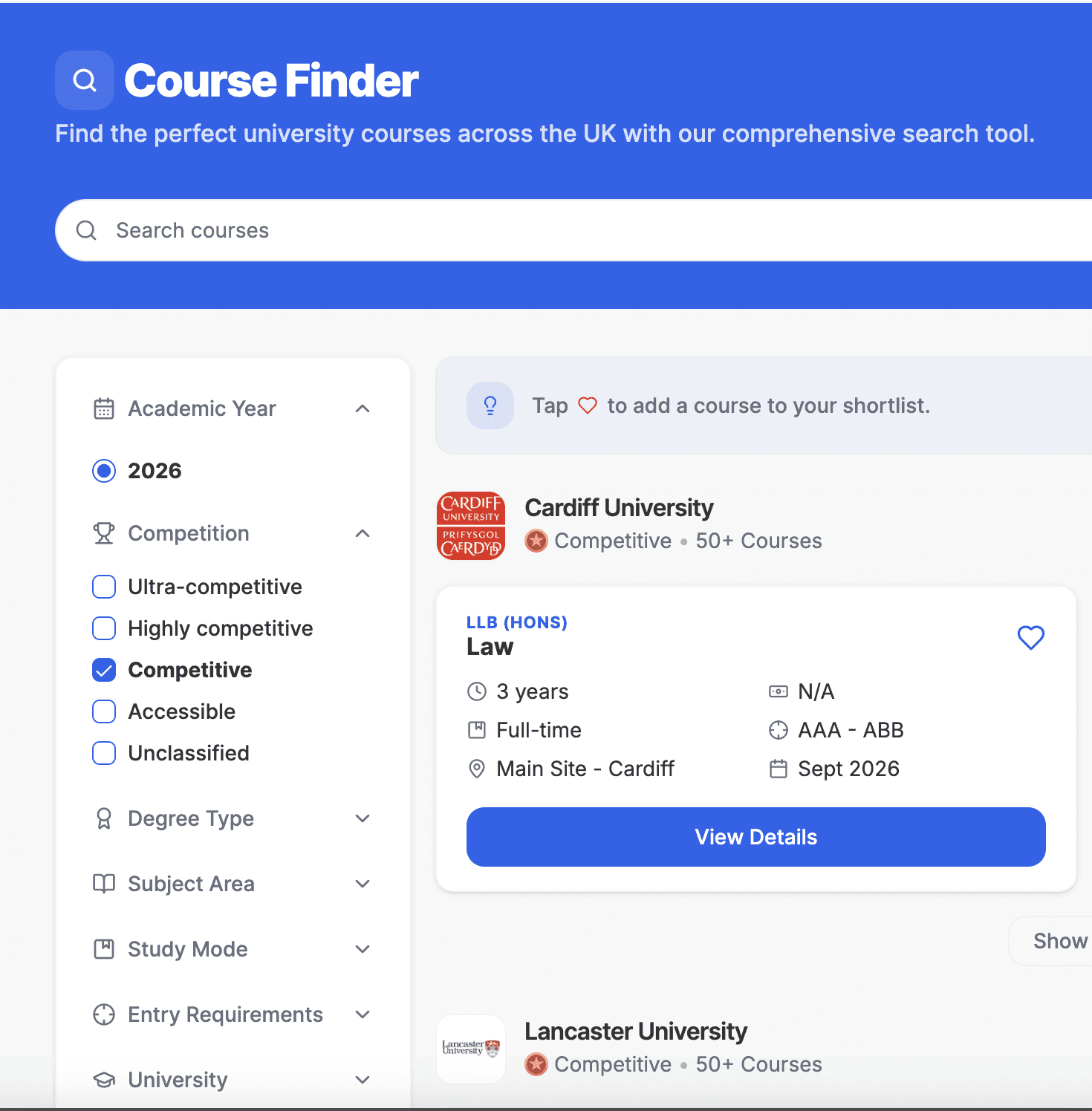 Search a database of UK degrees filtered by competition level and entry requirements. Save them to your shortlist, finalise your UCAS Top 5 and manage your Firm and Insurance choices in one place.