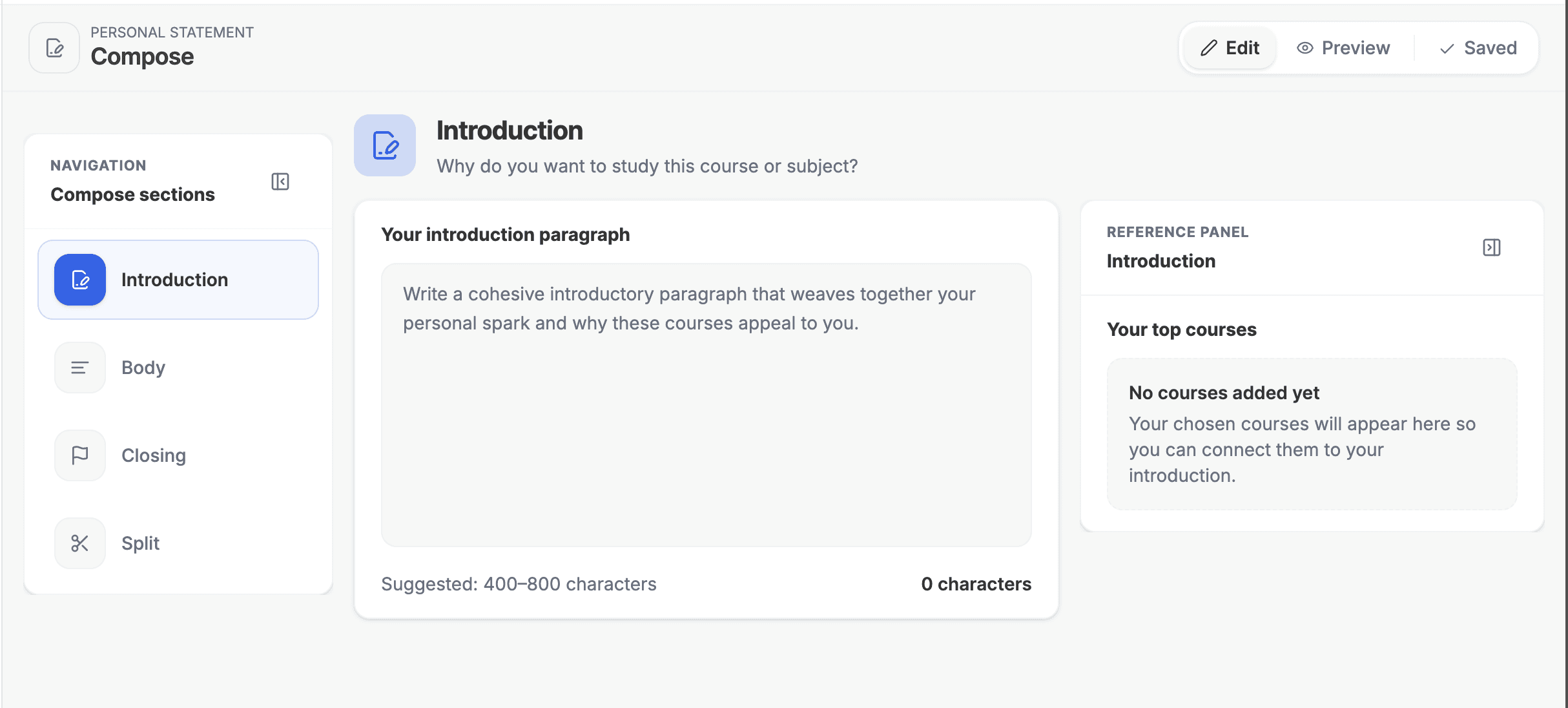 Forget outdated teacher advice and confusing UCAS prompts. Our guided composer forces you into the proven 4-phase structure that Top 30 universities actually want. Seamlessly pull in your logged reading notes, focus purely on academic analysis, and build a bulletproof statement bespoke to you.