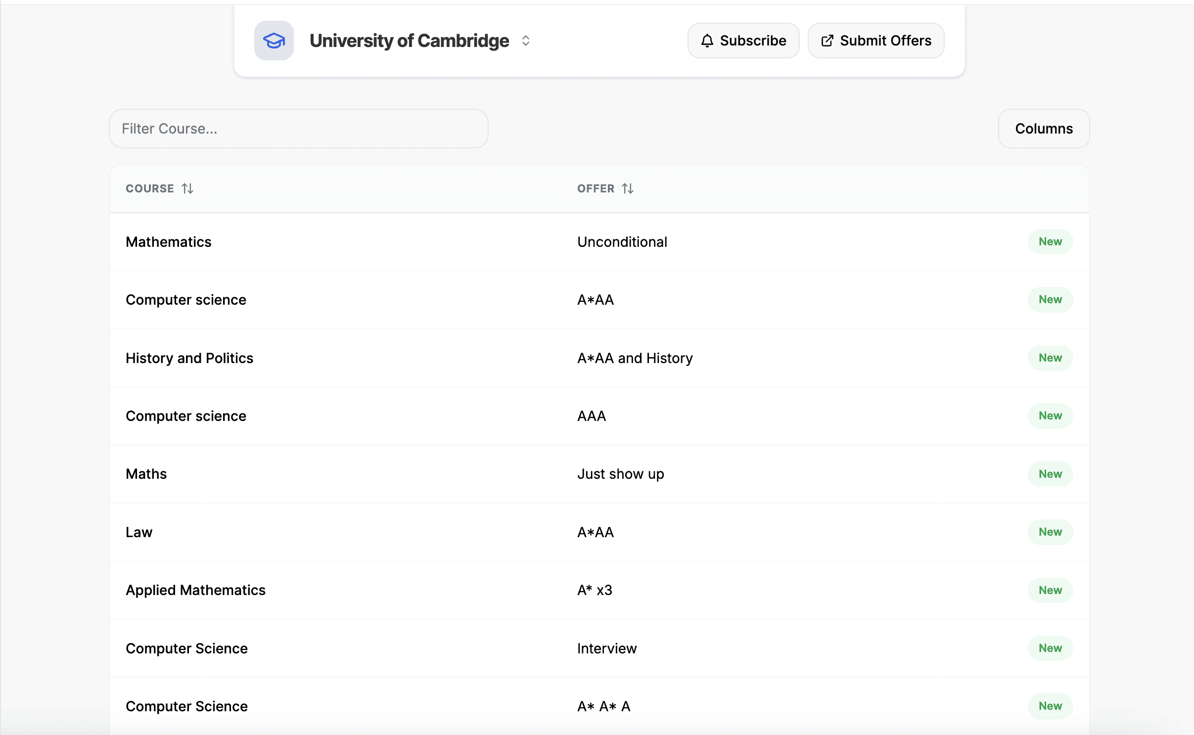 This is what students globally know us for. Don't rely on rumors, Reddit threads, or outdated league tables. Search over 15,000+ real, crowdsourced UCAS datapoints to see the exact grades, subjects, and timelines that secured offers (or rejections) from your dream universities last year.